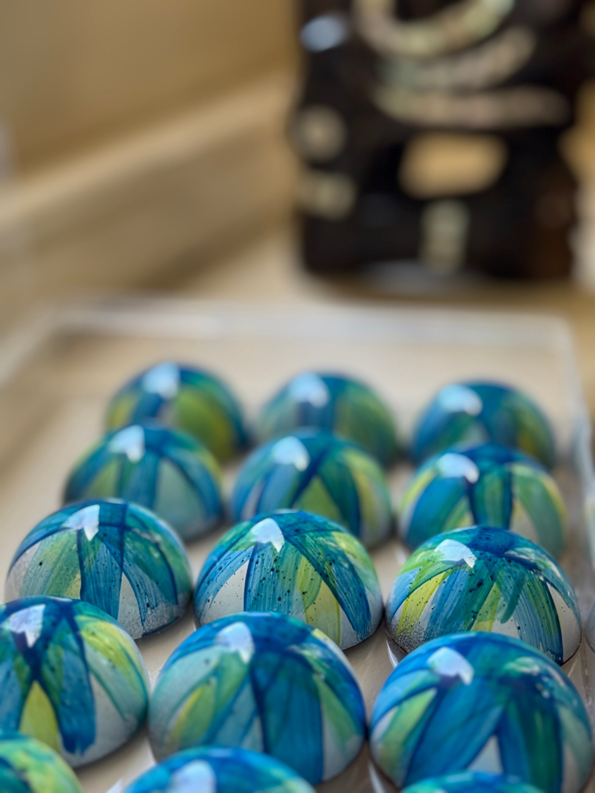 Each bonbon is hand-painted, which means yours will have its own little personality. While the colours and design shown are representative of the style, slight variations are part of what makes every piece unique.